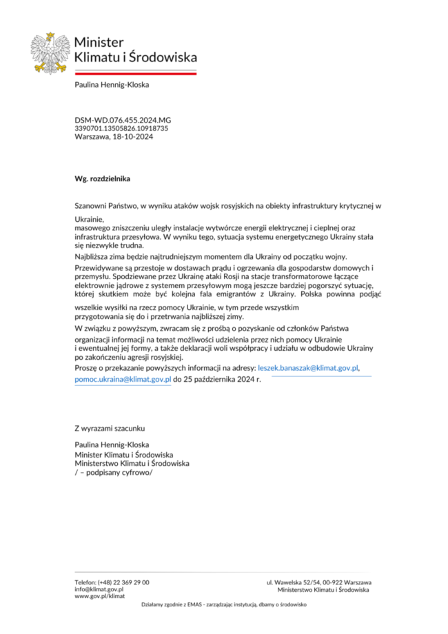 Ministerstwo Klimatu i Środowiska apeluje o wsparcie i współpracę na rzecz Ukrainy.    W wyniku rosyjskich ataków na Ukrainę,…